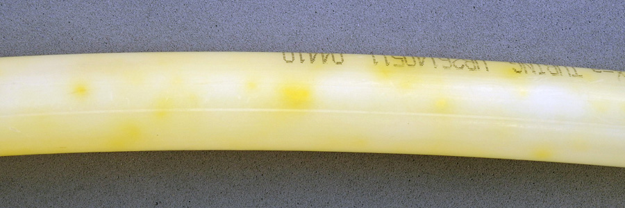 Hot water piping installed in the Jackson home in 2005 shows chlorine degradation and permeation of print line through the wall of the pipe
